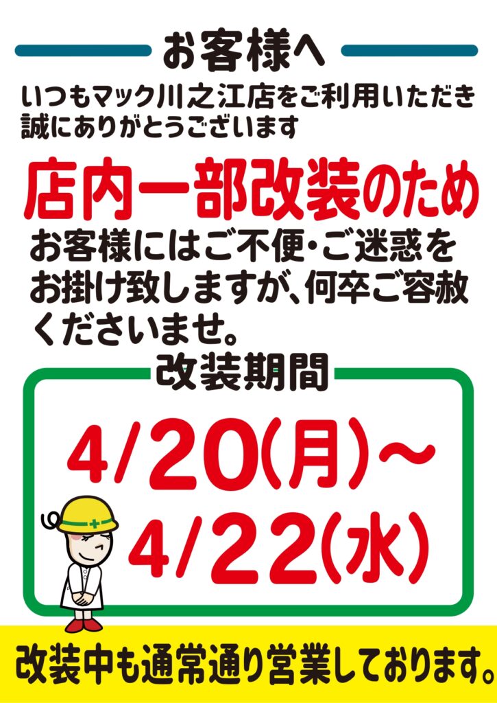ドラッグストアmac川之江店 一部改装のお知らせ